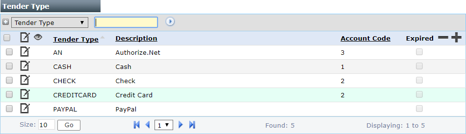 Because payments for fees and fines may come in many forms, the Tender Type panel allows administrators to determine which forms of payment will be accepted. From the Tender Type panel, you can add new tender types or view, edit, or remove existing tender types.