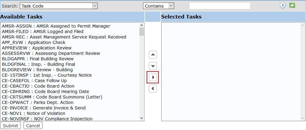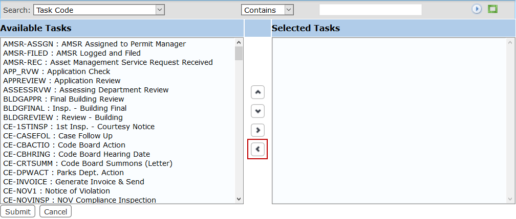 The selection window contains two fields: Available Tasks and Selected Tasks. The window also contains four arrow buttons.