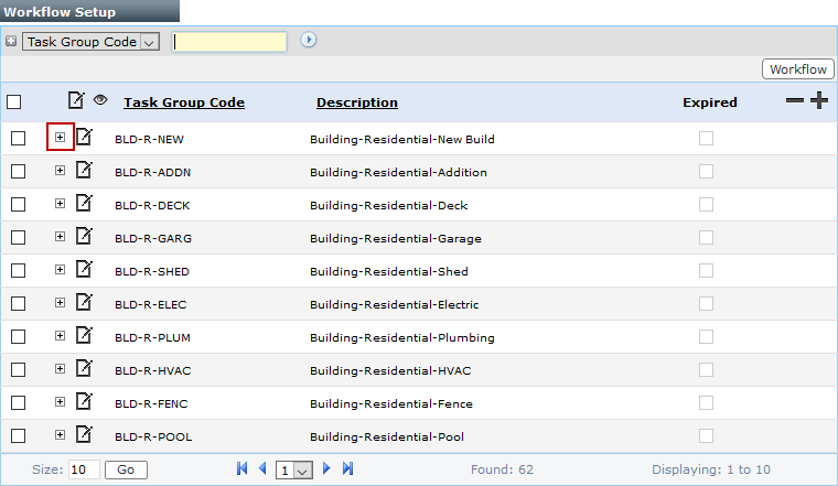 - On the Workflow Setup panel, click the plus icon next to the desired task group to open the group's sub panel.