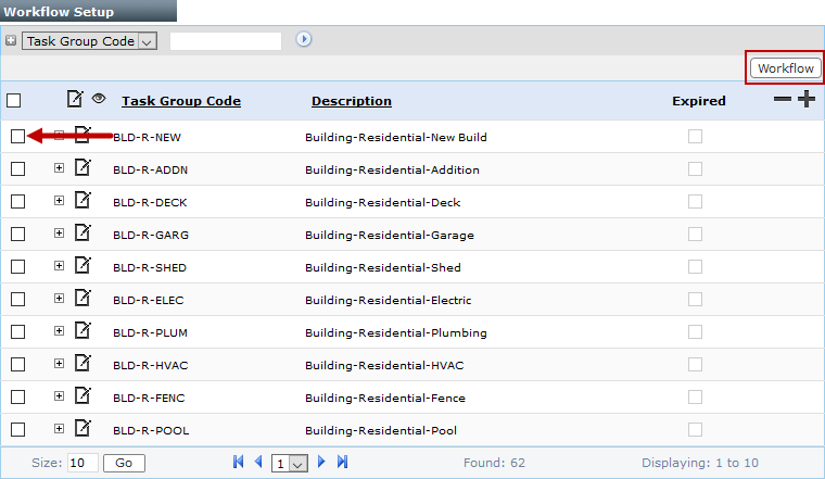 - On the Workflow Setup panel, select the check box next to the task group you want and click Workflow near the top of the panel.