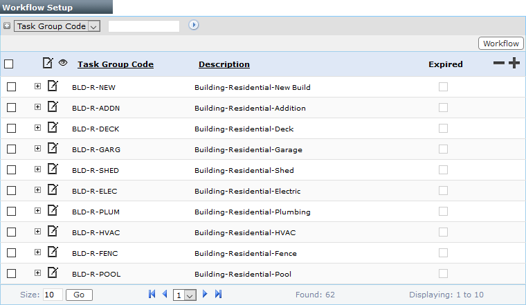 A workflow is a series of tasks that must be completed to accomplish a specific objective; this list of tasks must be completed before a case can be completed. It consists of a Task Group containing one or more Task Codes. From the Workflow Setup panel, you can add a new task group; add or remove task codes from a task group; or view, edit, or remove existing task groups.
