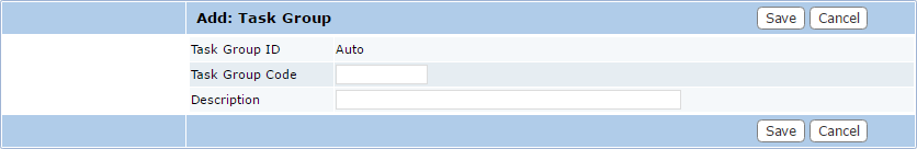 - On the Add: Task Group panel, enter a 10-character identifier for the group in the Task Group Code field and a brief explanation of its purpose in the Description field.