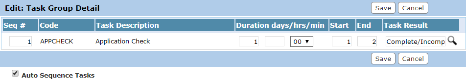 - Select the Auto Sequence Tasks check box to reorder the list of tasks according to Seq # value when you save the task.