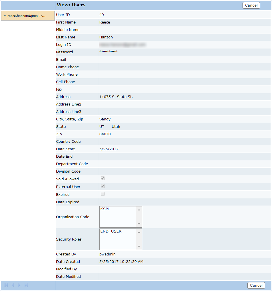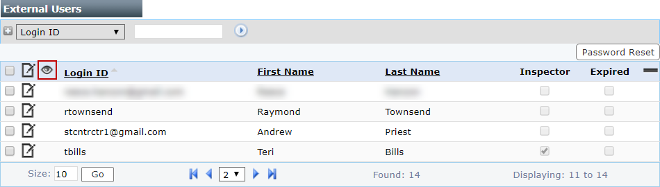 - On the External Users panel, select the check box next to the login ID of the user whose information you wish to view, then click View at the top of the panel.