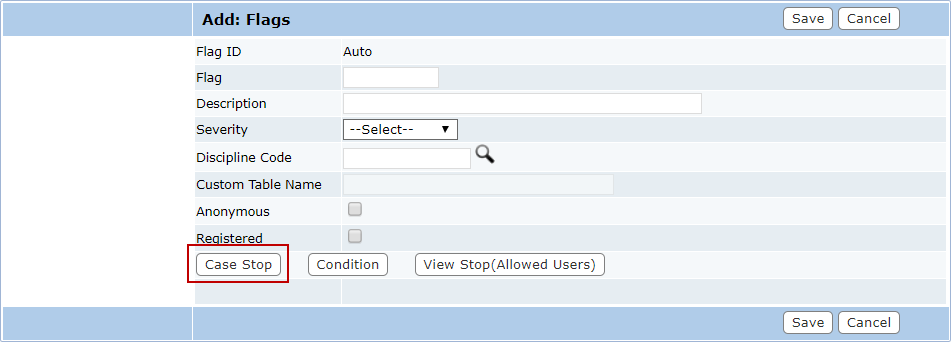 - Click Case Stop to set up the case type(s) to which this flag can apply a Case Stop flag severity.