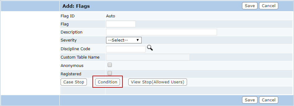 - Click Condition to set up the conditions that can be applied to the flag and must be met before the case may progress.