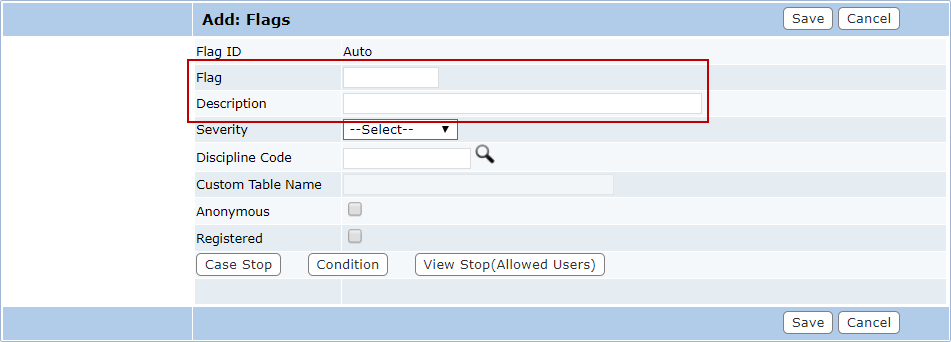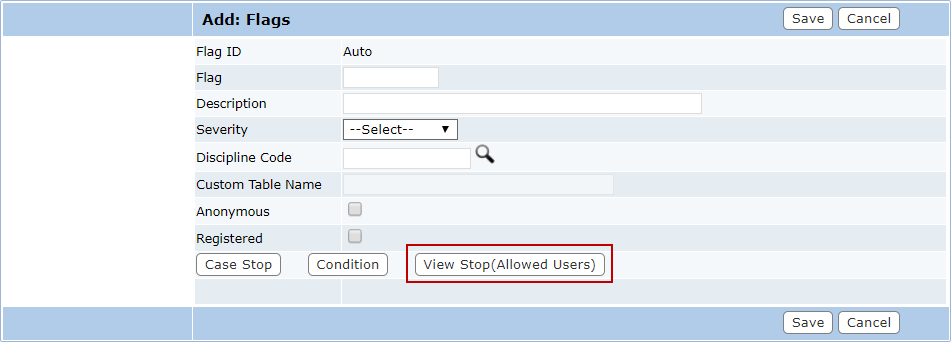 - Click View Stop(Allowed Users) to set up users that are allowed to view the case if the flag is active.