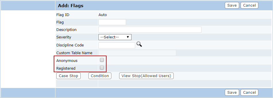 - Select the Anonymous and Registered check box if the flag will be available to guest users and registered Public Access users respectively.