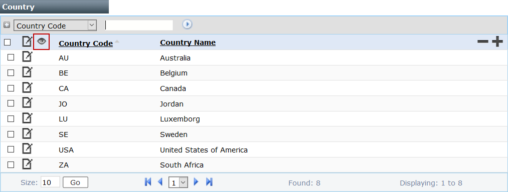 - On the Country panel, select the check box next to the country code you wish to view, then click View record at the top of the panel.