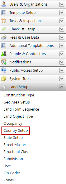 - Click Land Setup on the PLL Admin menu panel and select Country Setup.