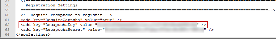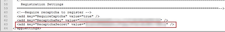 - Copy the Secret Key from your Google reCAPTCHA settings page and paste it into the value attribute of the add key="RecaptchaSecret" tag.
