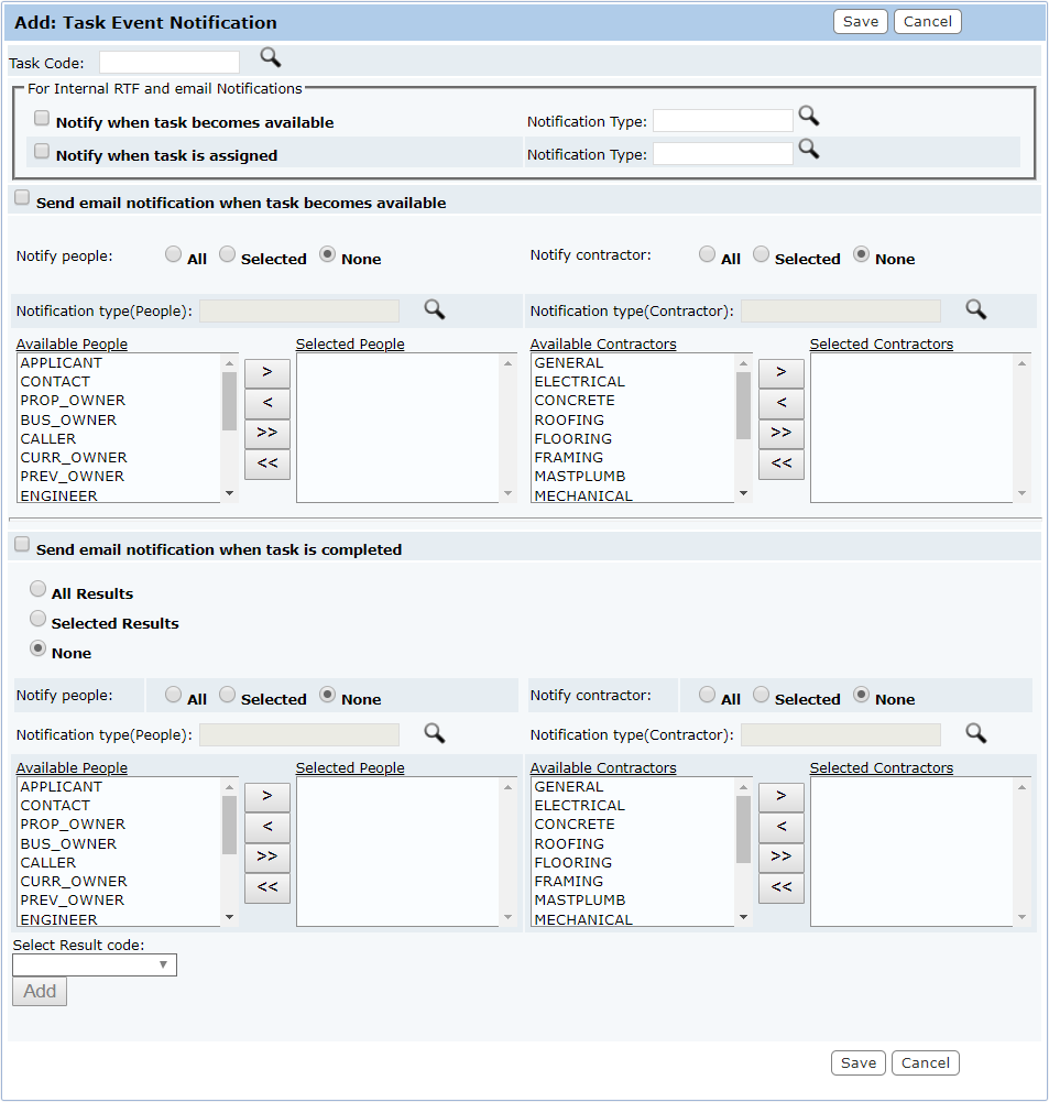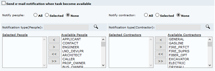 - Notify contractor: These option buttons control whether the notification will be sent to all contractor types, selected contractor types, or no contractor types.