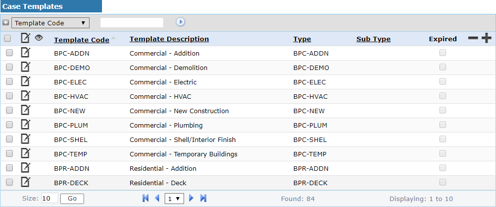 Templates are the fundamental operating unit in PLL. Every permit or license application created in PLL is based on one template or another. Configuring those templates correctly is crucial. The following topics will walk you through the steps of creating and configuring case templates and explain what each field, check box, and drop-down list does so that you can make sure your users have the best experience possible and your organization has the information it needs to run effectively and efficiently. From the Case Templates panel, you can add new case templates or edit, expire, or delete existing case templates.