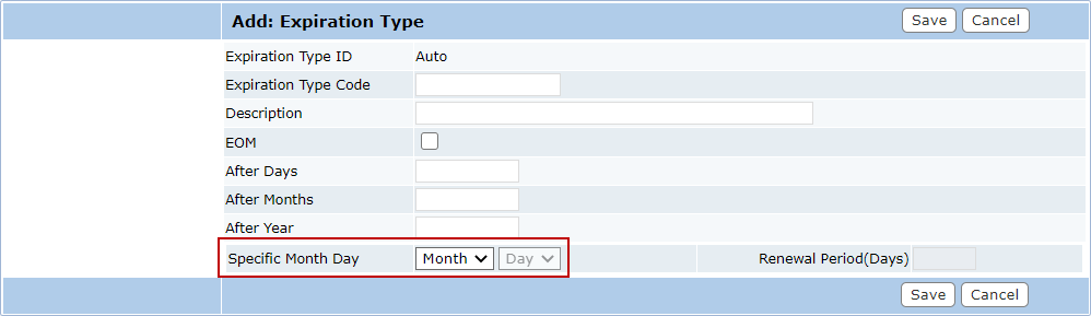 - Select the Eom (End of Month) check box to indicate that the expiration will occur at the end of the month, regardless of which day of the month the exact time limit expires.