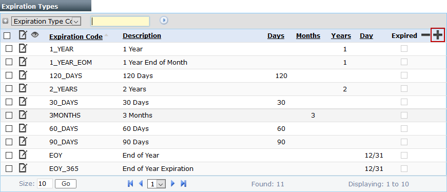 - On the Expiration Types panel, click Add record at the top of the panel.