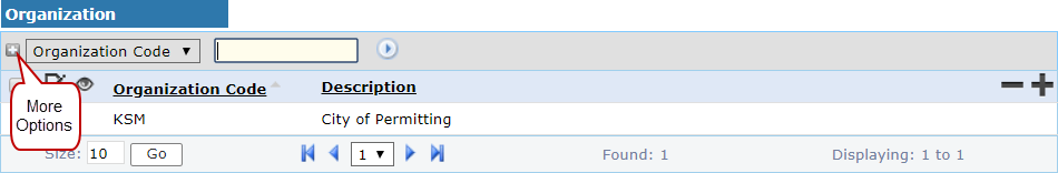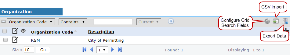 Configure Grid Search Fields, CSV Import, and Export Data icons appear in the upper-right. These options allow you to configure grid search fields, import CSV files, and export data. These are administrative functions.