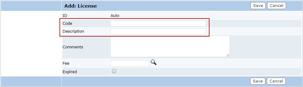 - Click Lookup next to the Fee field to select the appropriate fee associated with the license.