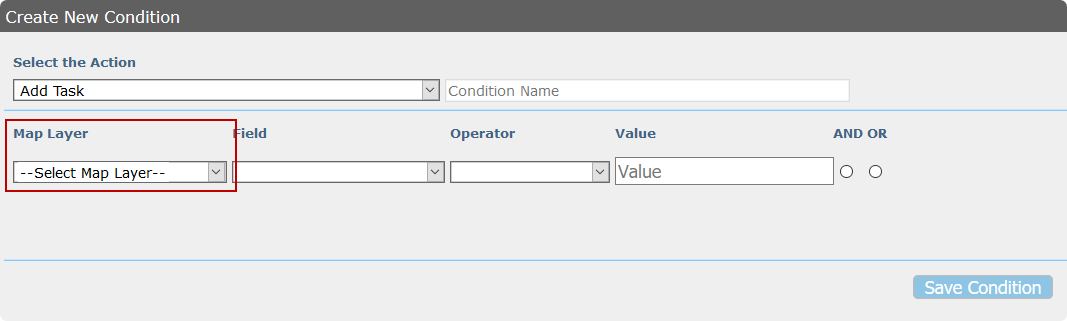 - On the Create New Condition panel, click the Select the Action drop-down list to select the action you wish to occur (Remove Task, Add Task, or Assign Task) and enter a name or description for the condition in the Condition Name field.