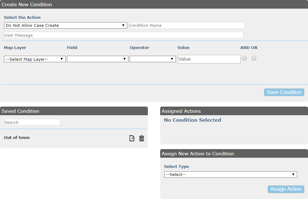 This section covers all the fields contained in the Create New Condition and Assign New Action to Condition panels.