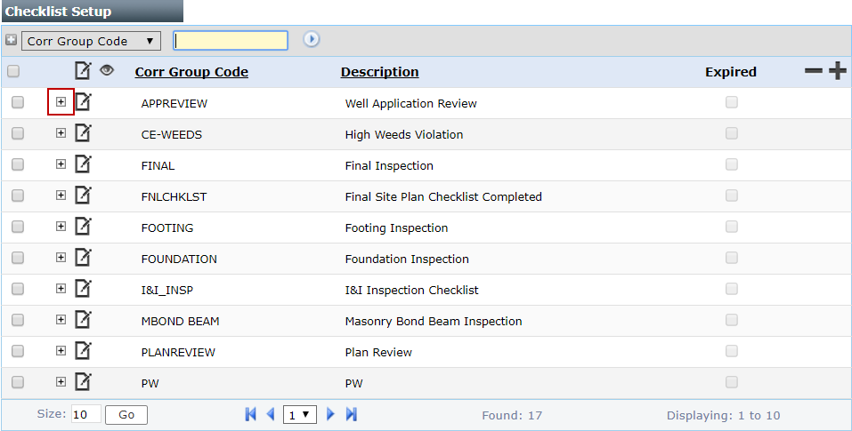 - On the Checklist Setup panel, click the plus icon near the checklist you wish to modify.