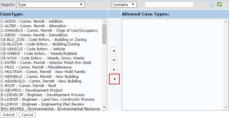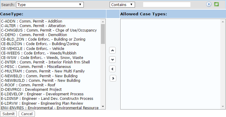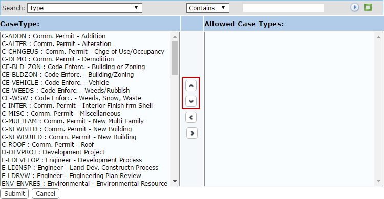 The selection windows contain two fields: CaseType or Task on the left, and Allowed Case Types or Allowed Tasks on the right. The windows also contain four arrow buttons.