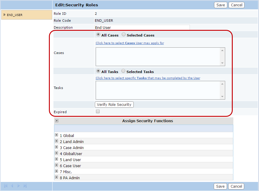 - After you have finished selecting items, click Save on the Edit: Security Roles panel.