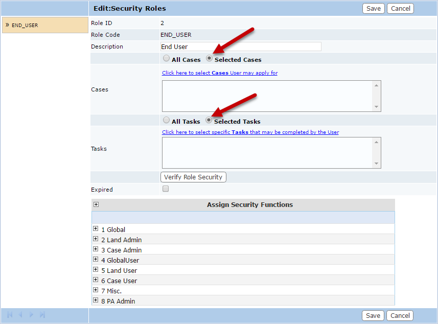- To limit the security role's access to specified cases or tasks, select Selected Cases or Selected Tasks.
