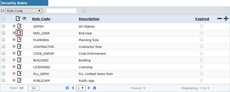 - On the Security Roles panel, click Edit record next to the security role you want to edit.