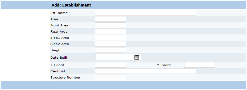 Use the Add: Establishment panel to enter the name of the business or other occupant of a space within a structure. All other text boxes in the panel refer to information for the establishment, not to the structure that it is located in.