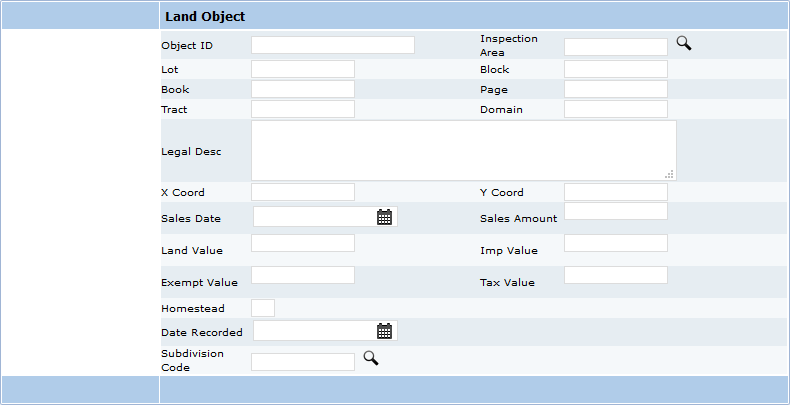 The Land Object panel is the basic required panel for the Land sequence. The Land Object panel collects specific information identifying a parcel’s legal ID, address, etc., as legally recorded in land records, along with valuation data from the most recent sales activity.