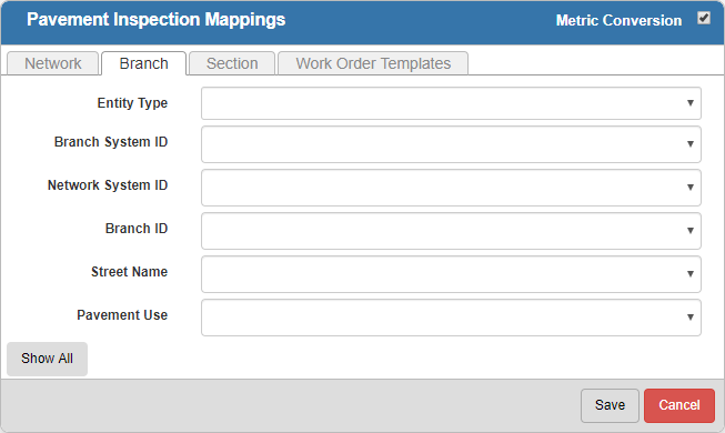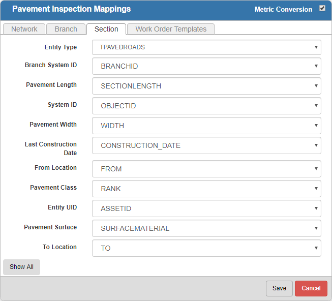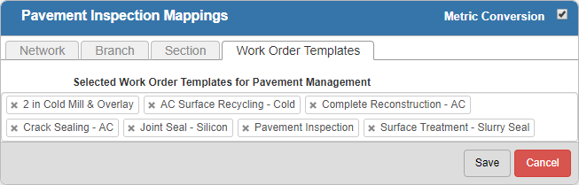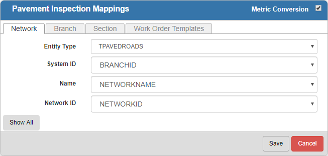 The Pavement Inspection Mappings panel has the following tabs: Network, Branch, Section, and Work Order Templates.