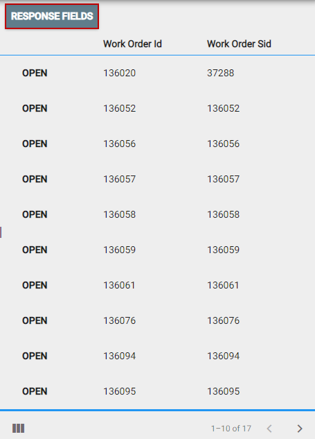 The Response Fields panel is populated with fields from the query type's table. For example, if the query type is work order, then fields from a work order appear in the list.
