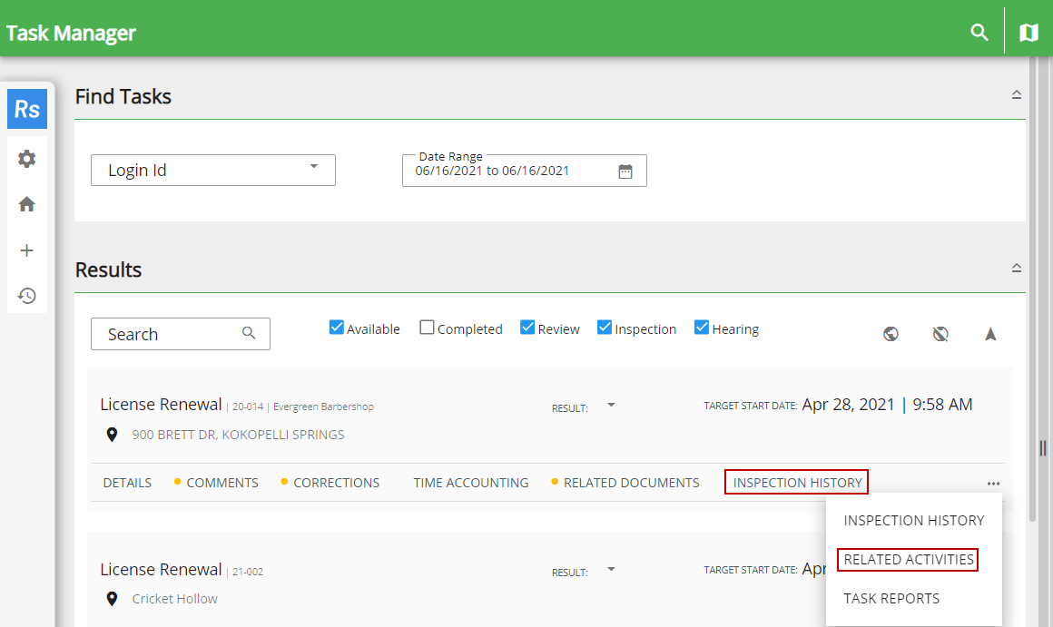 2. Tap Inspection History or Related Activities for the task you want to view.