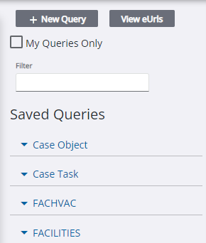 1. Select an existing query from the Saved Queries section. Enter the query name in the Filter field to filter the list or select My Queries Only to filter the list based on queries you own.