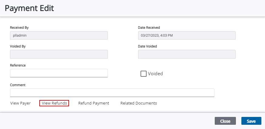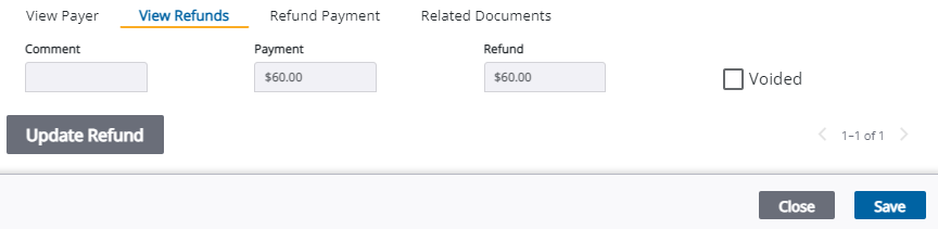 1. Select the Voided check box to void any refunds made in error. Refunds should be voided instead of removed to preserve the history of the cash flow and accurately identify why changes were made to the transaction.