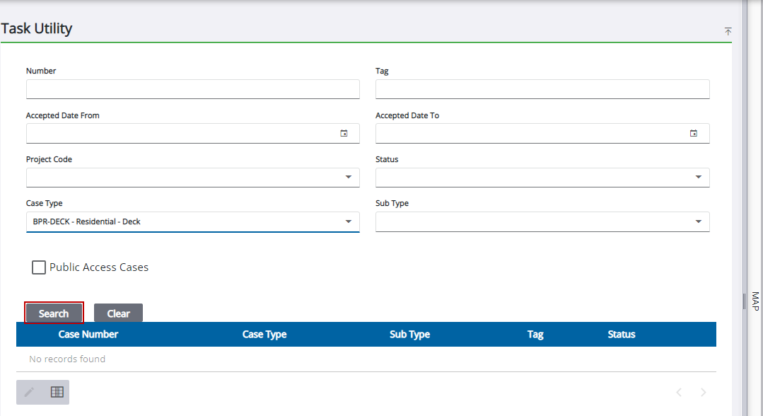 1. Enter search criteria, such as the case number or case type, in the corresponding fields.