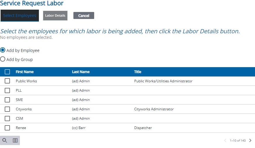 1. From the Select Employees tab of the Service Request Labor panel, use Add by Employee or Add by Group to select employees.