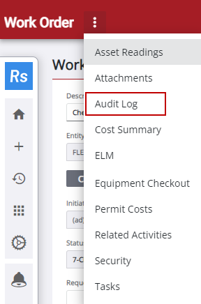 The audit log shows any changes made to the work order. The domain administrator determines which fields are tracked in Admin.