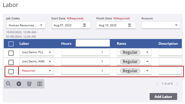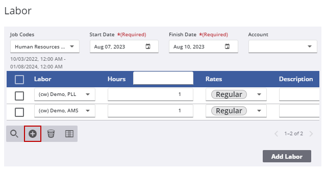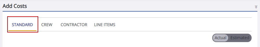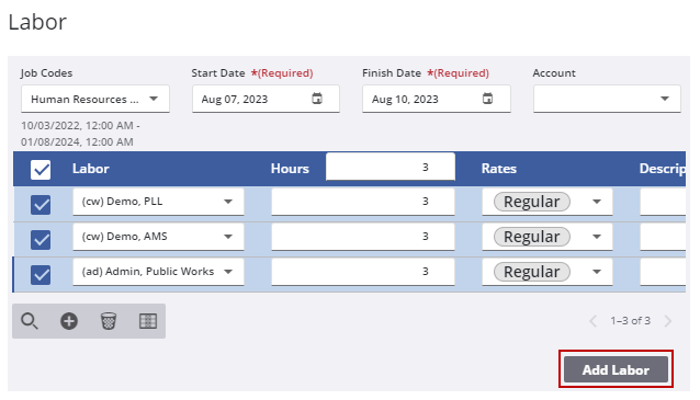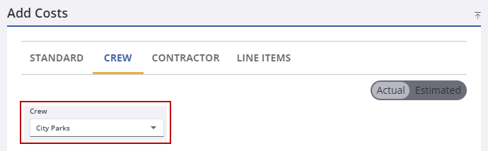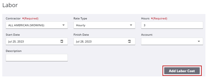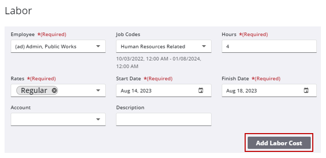 Labor for a work order, inspection, or service request can be added in ELM on the Add Costs and the Labor Costs panels.