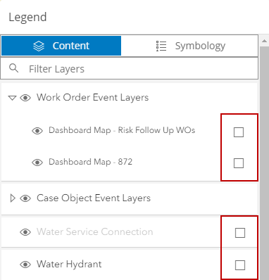 • Event layers must be made visible in the Legend map tool to be selected on the map. See Event Layers for more information.