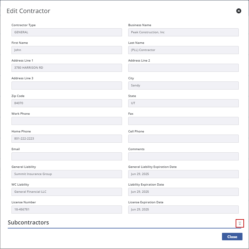 1. At the bottom of the Edit Contractor panel, tap the arrow to expand the Subcontractors section.