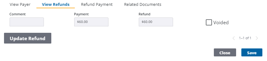1. Select the Voided check box to void any refunds made in error. Refunds should be voided instead of removed to preserve the history of the cash flow and accurately identify why changes were made to the transaction.