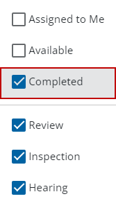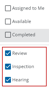 You can filter tasks by the type of task, if it's available or completed, or which tasks are assigned to the user who is currently logged in. Tasks can be filtered from the Workflow panel on the case summary page or from the Workflow page.
