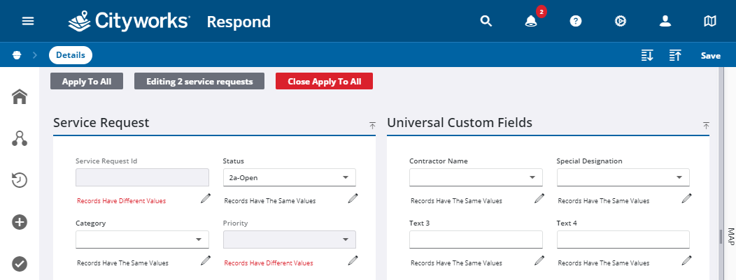 If values are the same across all the service requests, the field can be edited and it says Records have the same value. If values for a field differ between the different service requests, the field is grayed out and it says, Records Have Different Values.