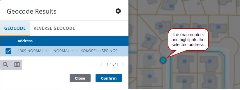 When you enter an address and select Geocode, the case is geocoded to the X and Y coordinates on the map. Geocoding gives you the opportunity to pinpoint a specific address or parcel making it easier to visually compare, map, calculate, and analyze data.