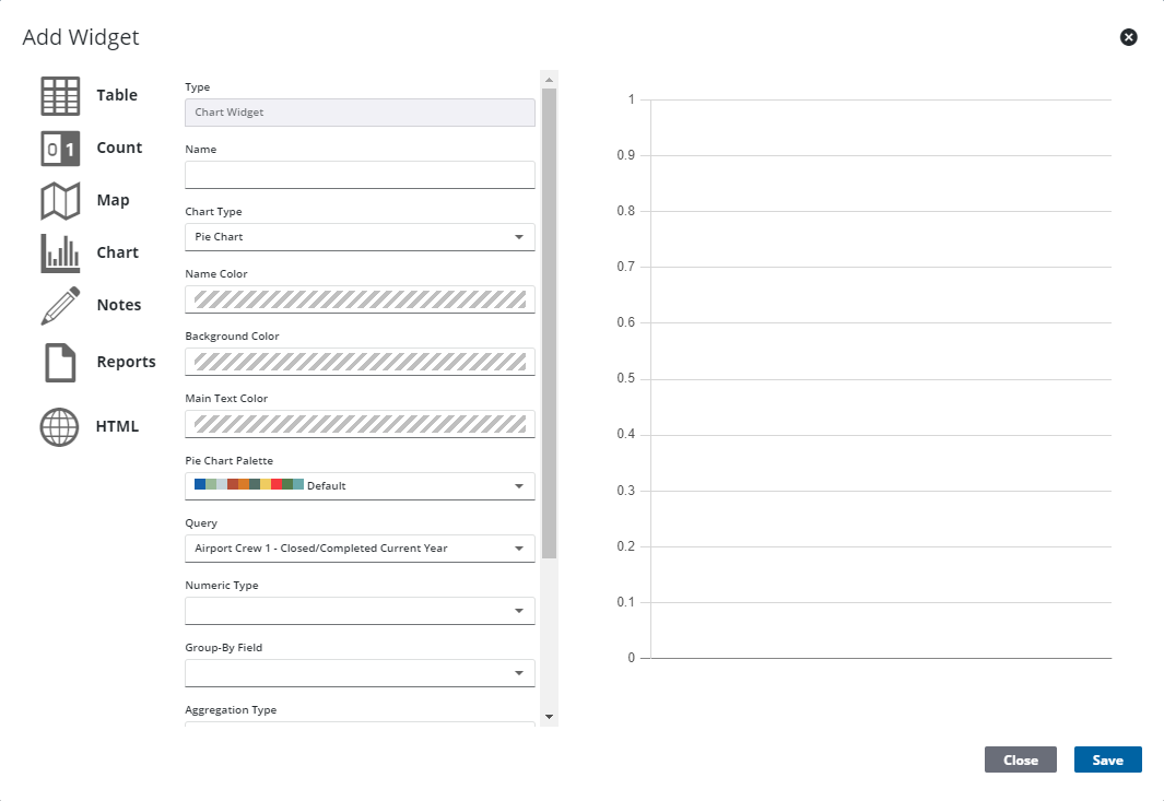 NOTE: A preview appears to the right on the Add Widget panel that dynamically changes as you define fields for the widget.