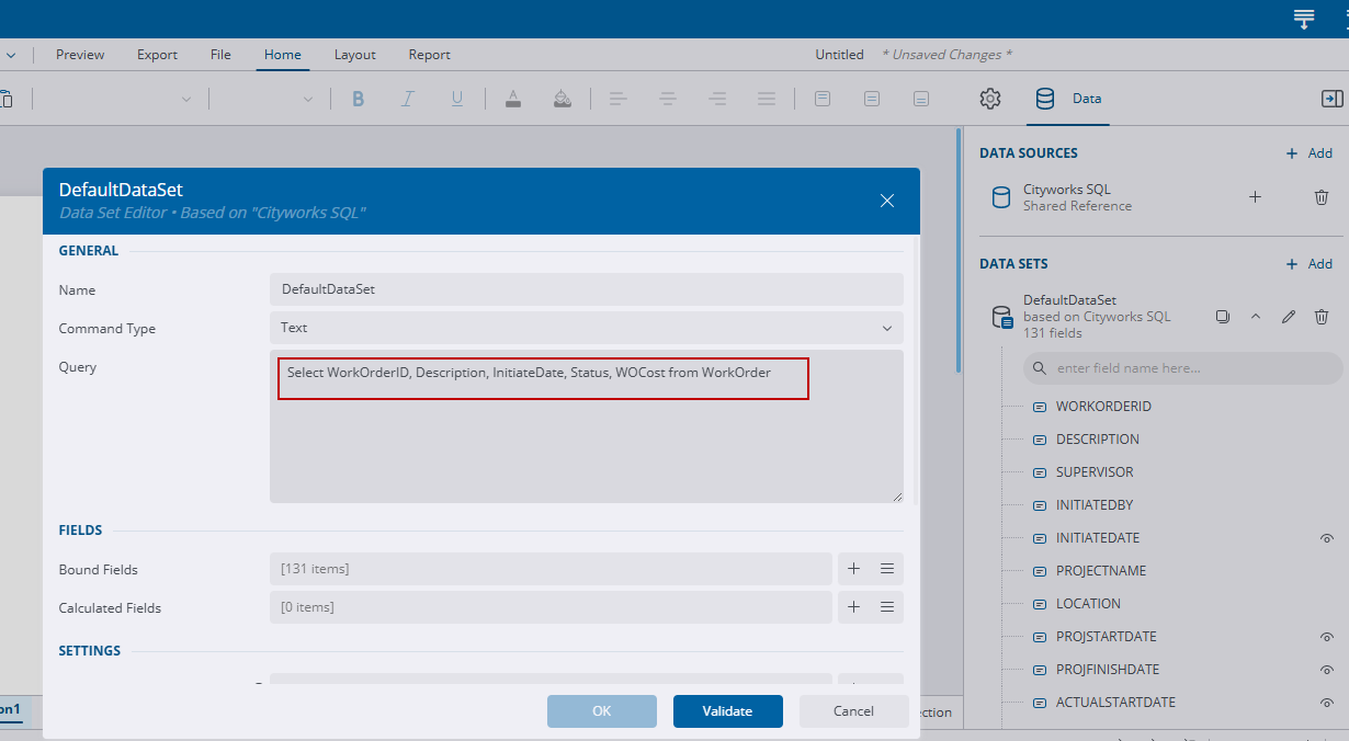 NOTE: If you are an Oracle client, additional formatting for fields is required. After a field is dropped in the report, it must be formatted this way: (First(field, "DataSetName")). For example, if the case number field was added it would look like the following: (First(CASE_NUMBER, "DefaultDataSet")).