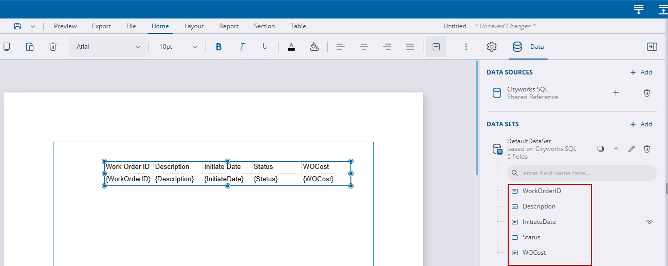 - Drag and drop fields from the data set to add the Cityworks data, or from the Common Values panel.