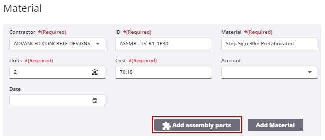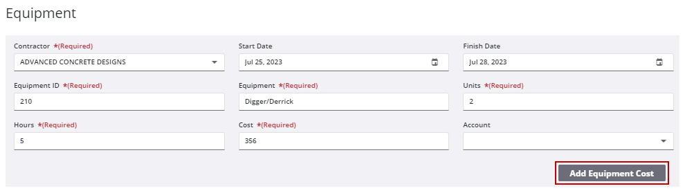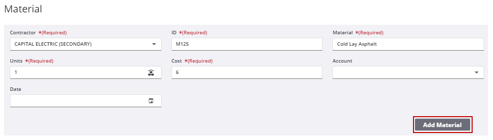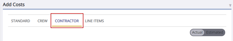 Contractor costs for a work order, inspection, or service request can be added in ELM on the Contractor tab of the Add Costs panel.