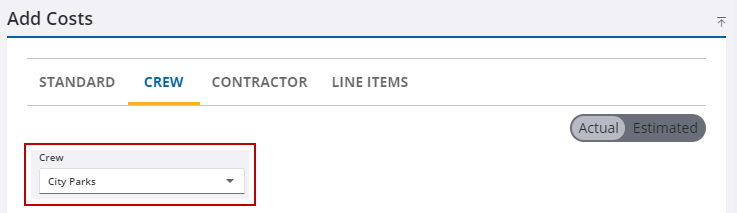 Crew costs for a work order, inspection, or service request can be added in ELM on the Crew tab of the Add Costs panel.